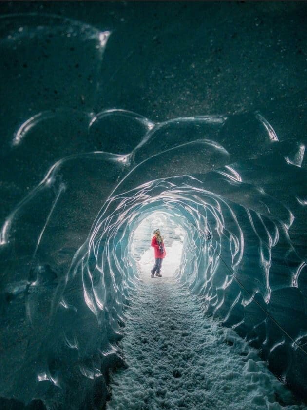 En journée, les possibilités sont nombreuses et variées. Mars permet encore de vivre de véritables expériences hivernales, tout en profitant de conditions plus agréables qu’en plein cœur de l’hiver. Tout comme le mois de février, Mars est un mois idéal pour partir explorer les glaciers. Équipé de crampons, d’un piolet et d’un baudrier, vous pourrez découvrir des formations spectaculaires comme des crevasses, des moulins voire des grottes de glace. Si ces excursions, qui doivent impérativement se faire accompagner d’un guide certifié, sont accessibles à la plupart des voyageurs et ne nécessitent pas d’expérience préalable, une bonne condition physique est toutefois requise. À noter par ailleurs que lors de ces excursions, l’itinéraire peut être amené à évoluer en fonction des conditions météorologiques et de sécurité. En effet, si certaines zones ne sont pas praticables (y compris les grottes de glace), les guides adaptent toujours le parcours afin de vous faire découvrir d’autres formations de glace tout aussi impressionnantes, en garantissant une expérience à la fois immersive et sécurisée. En effet, l’accès aux grottes de glace dépend entièrement des conditions météorologiques et de la stabilité de la glace : la sécurité restant prioritaire, certaines grottes peuvent être trop dangereuses ou impraticables (inondées), il convient alors de trouver une alternative. Cette information vous est en général communiquée lors de la réservation de votre excursion. Sachez pour autant que les formations que vous pourrez voir sur le glacier sont tout autant magnifiques et partir à l’aventure sur le glacier signifiera également s’éloigner de la foule. Enfin, lors de la réservation d’une grotte de glace, il est important de savoir que vous ne visiterez jamais la même grotte d’une année à l’autre — en chaque début de saison, les guides partent en quête de grottes de glace explorables et suffisamment sécurisées pour y amener les visiteurs. Ne demandez donc jamais à visiter la grotte dont vous avez vu les photos sur les réseaux sociaux l’année d’avant !